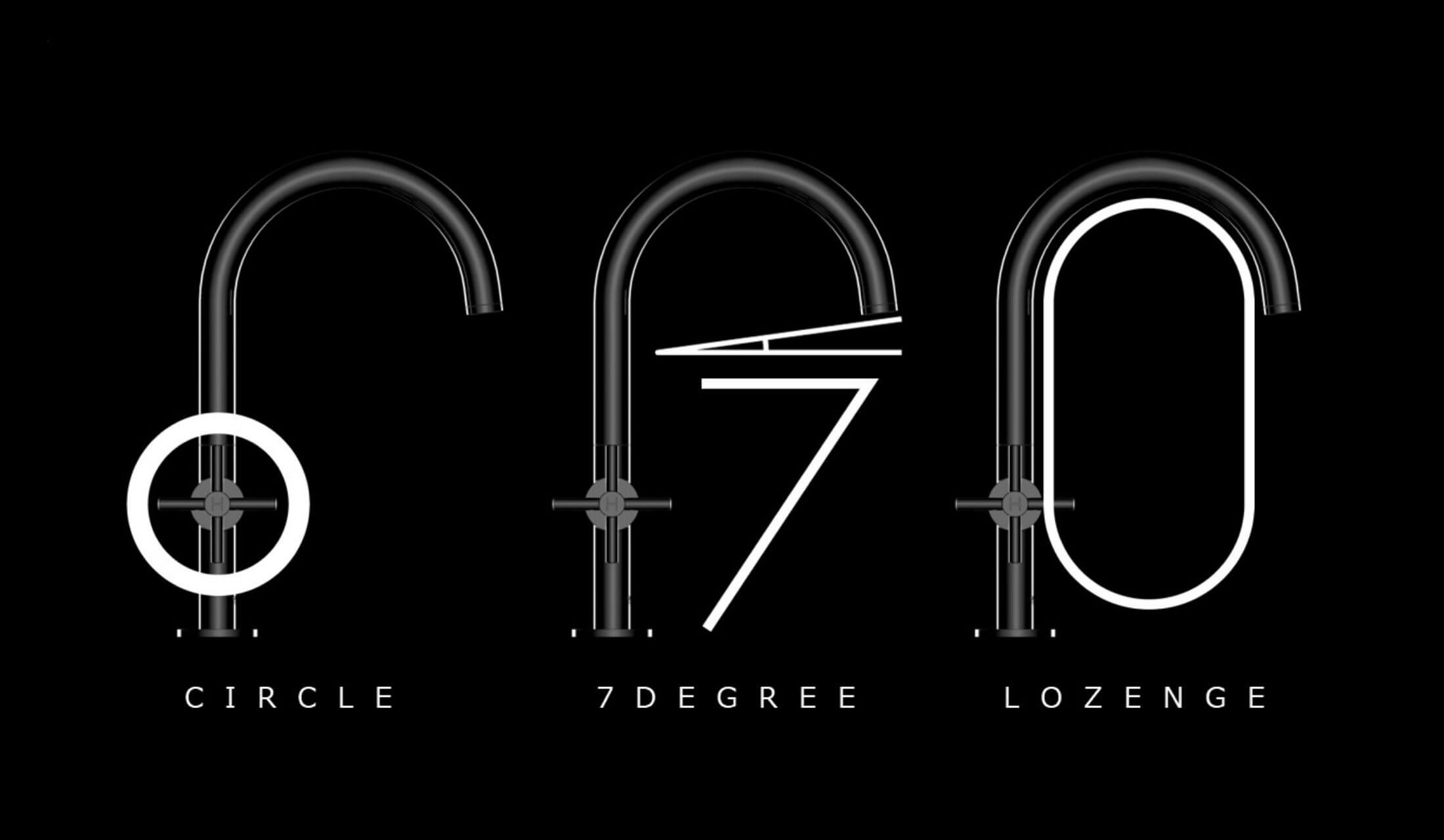 GROHEのデザインDNAを象徴する「シグネチャーエレメンツ」。製品の機能や目的を強調する正円、人が自然に操作しやすい7度の角度、デザインの構成に調和をもたらす楕円のすべて、またはいずれかの要素で構成しています