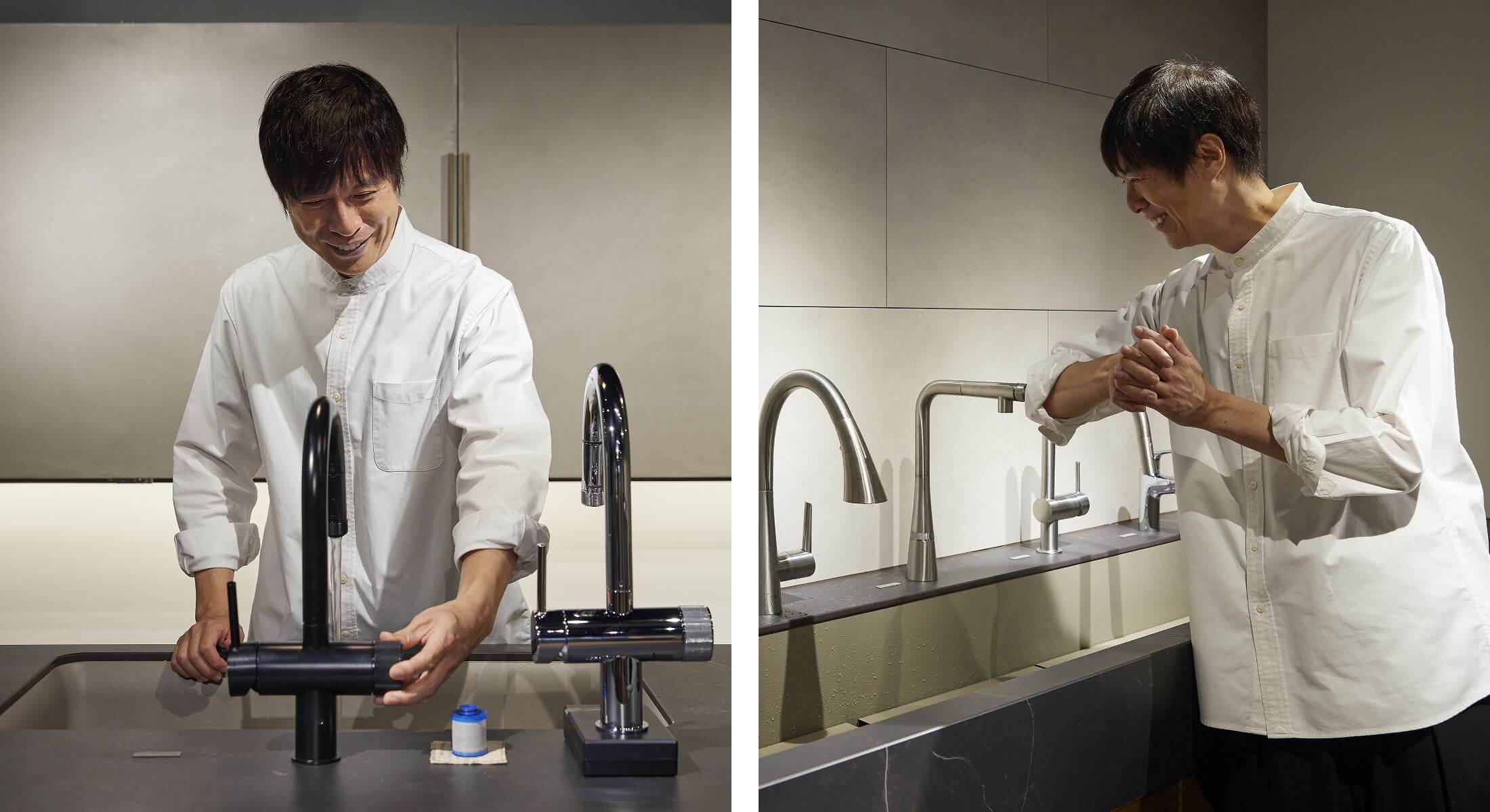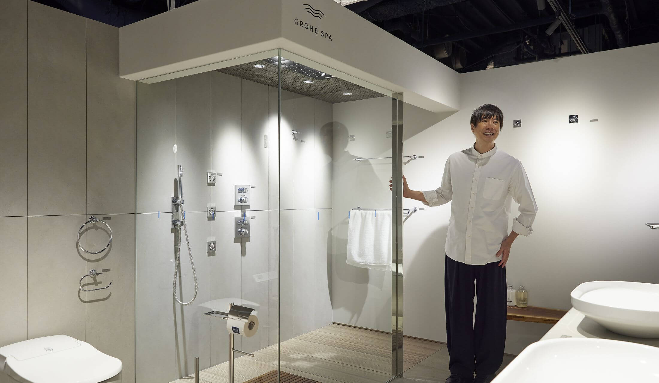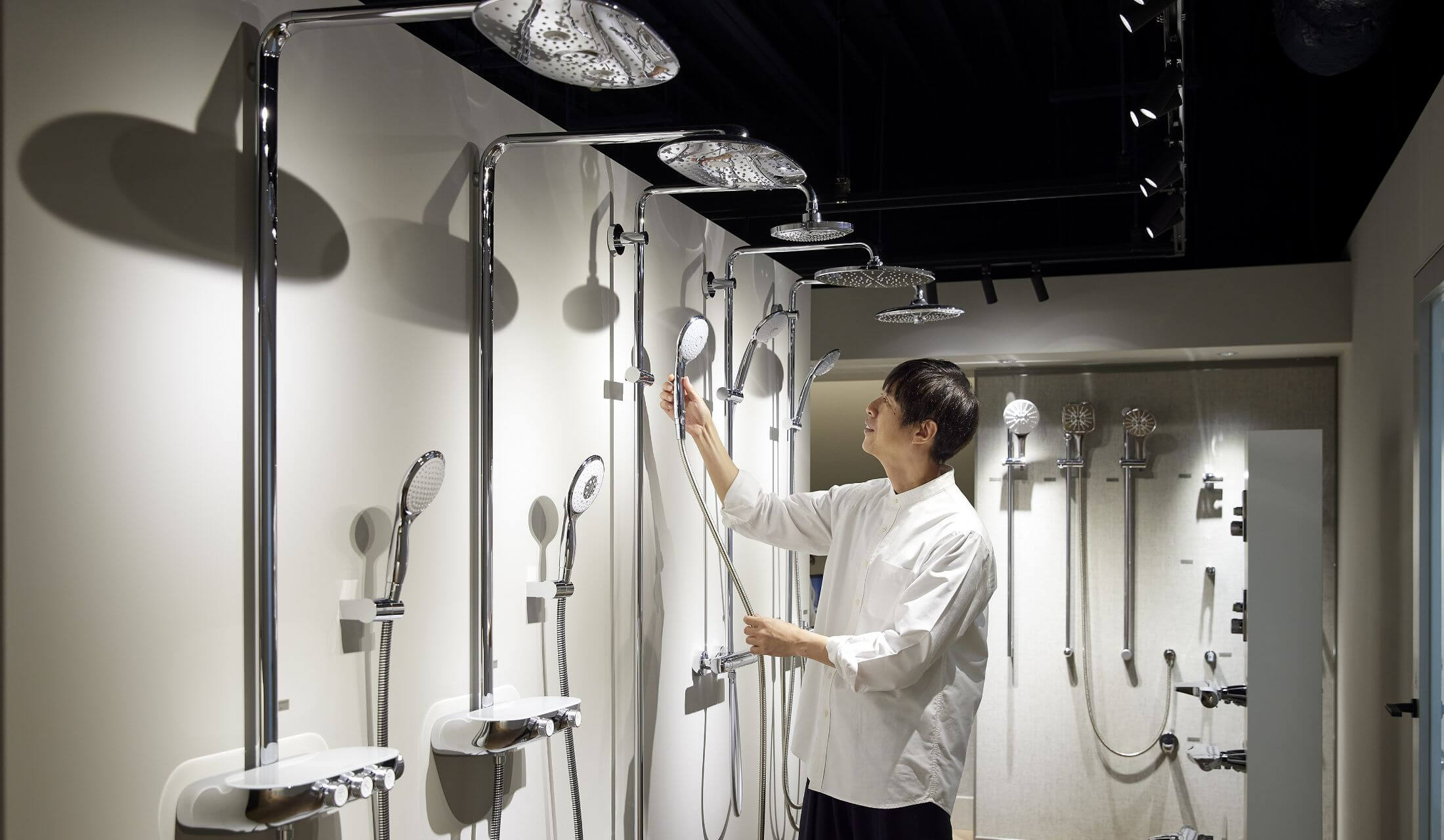 「シャワー中に新しいレシピのアイデアが浮かぶんです」と微笑むコウさん。ショールームでも、最新のシャワー水栓に興味を寄せていました