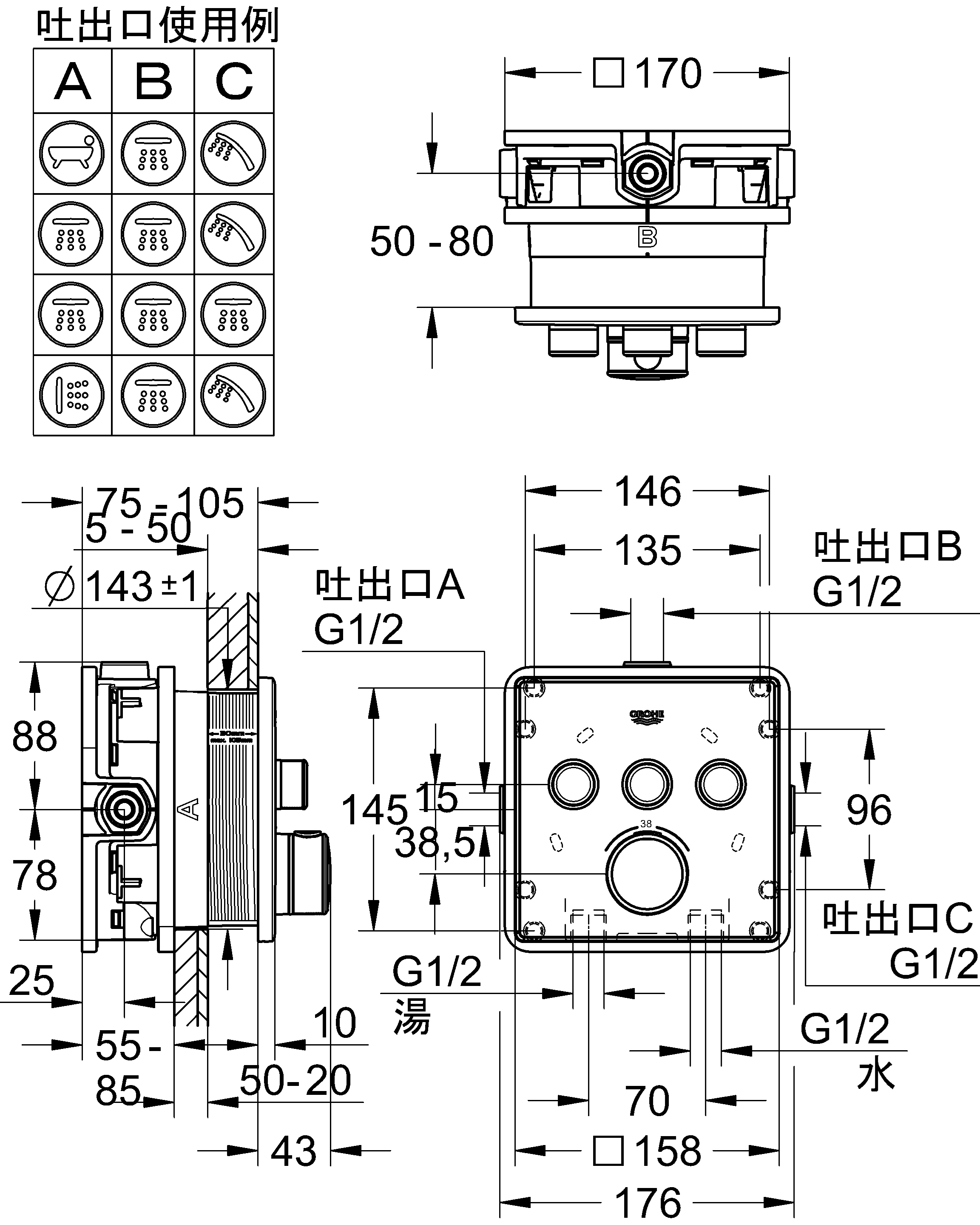 ■吐水パターンのボタン表示は、オーバーヘッドシャワー、ハンドシャワー、バスタブマーク等複数同梱されています。吐出口の種類、接続に合わせて取付けてください。